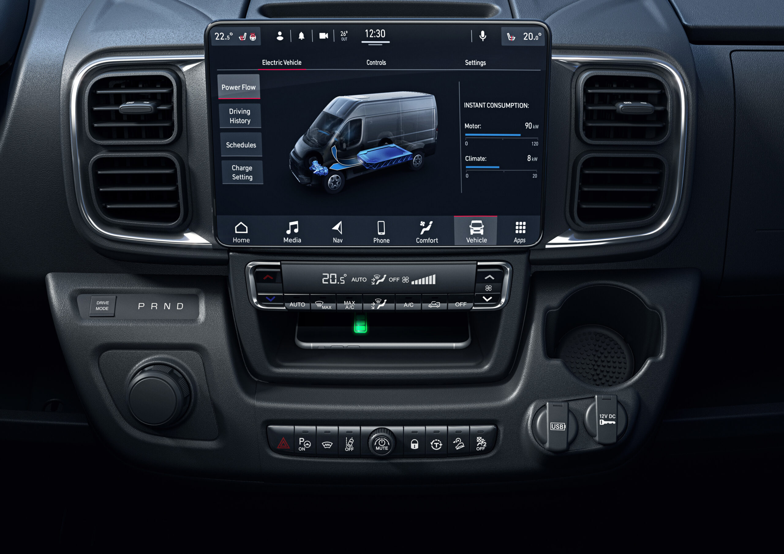 Priklausomai nuo pageidavimų, „Movano Electric” vairuotojai gali rinktis vieną iš trijų važiavimo režimų, kad optimaliai išnaudotų našumą ir ridą: „Normal” (ribota 160 kW galia), „Eco” – optimizuoti ridą (120 kW) ir „Power” – maksimalus našumas (200 kW). Už vairo esančiomis mentelėmis vairuotojas taip pat gali nustatyti keturis rekuperacijos lygius stabdant.